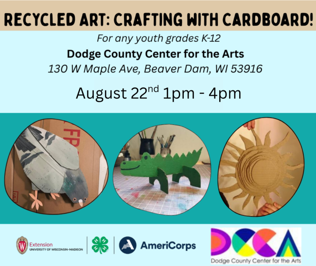 Join us for Recycled Art: Crafting with Cardboard! Youth in grades K-12 are invited to get creative with recycled materials at the Dodge County Center for the Arts on August 22, from 1–4 pm. This fun, hands-on workshop encourages imagination, sustainability, and artistic expression!