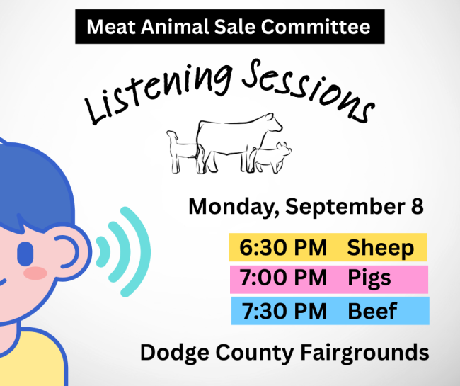 Meat Animal Sale Listening Sessions Share Share:Share on FacebookShare on X (Twitter) Share via EmailCopy LinkCopied! You are viewing information about a past event. Event Information Date September 8th, 2025Time 6:30pm - 8:00pm Event LocationDodge County Fairgrounds