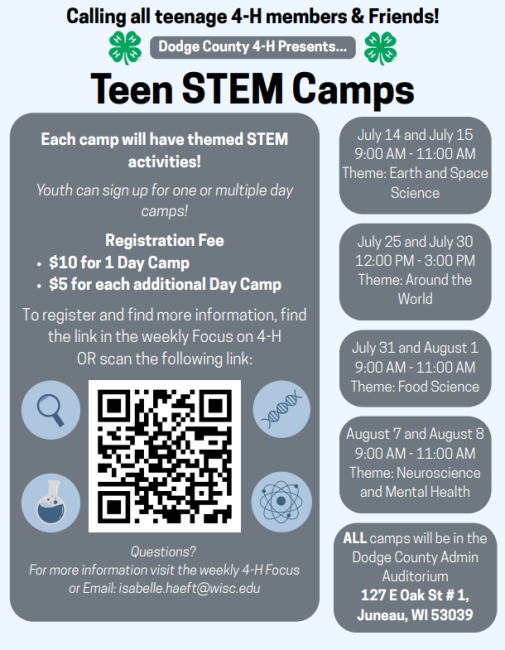 Calling all teenage 4-H members and friends! This summer’s Teen STEM Camp programs will explore topics like astronomy, engineering, genetics and genomics, brain anatomy, and more! We will have four different program opportunities: Earth and Space Science, Around the World, Food Science, and Neuroscience and Mental Health.